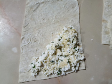 Сверните полоски лаваша треугольниками. При этом все края должны быть обернуты лавашом, тогда начинка не вытечет из конвертика.