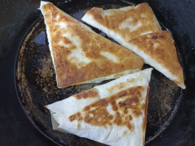 В сковороде на небольшом огне разогрейте растительное масло. Масла должно быть столько, чтобы все дно сковороды было им покрыто. О том, как подобрать идеальную сковороду, а также как правильно выбрать растительное масло, читайте в отдельных статьях, ссылки в конце рецепта. Выложите заготовки из лаваша и обжарьте по 2-3 минуты с каждой стороны до появления румяной корочки.