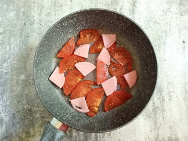 На завтрак приготовила очень вкусную яичницу с помидорами и сыром. Сначала подрумянила ломтики помидора с одной стороны. Затем перевернула их и выложила ломтики вареной колбасы (дополнила блюдо от себя для большей сытности).