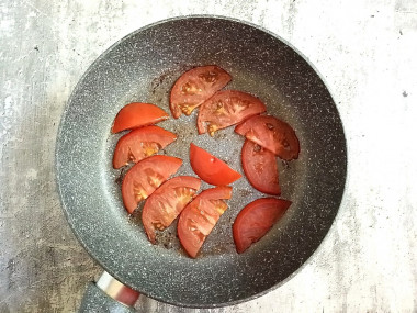 Сковороду нагрейте на среднем огне и налейте немного растительного масла. Выложите на горячую сковороду кружки помидоров. Обжарьте их в течение минуты, затем переверните.