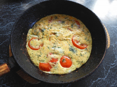 Залейте обжаренные помидоры яичной смесью. Немного перемешайте и накройте крышкой. Готовьте на маленьком огне 3-5 минут до готовности — яйца должны полностью схватиться. Затем огонь выключите и оставьте постоять 2-3 минуты, чтобы блюдо окончательно дошло. Готовое блюдо можно подать прямо в сковороде. А можно аккуратно выложить на тарелку и подавать к столу. Перед подачей посыпьте яичницу свежей зеленью. Приятного аппетита!