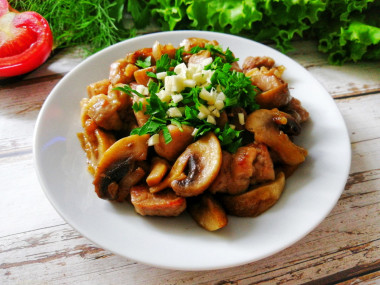 Получилось необыкновенно вкусно! Мясо с грибами вышли очень аппетитными, с чесночной остринкой, а шампиньоны к тому же невероятно сочными.