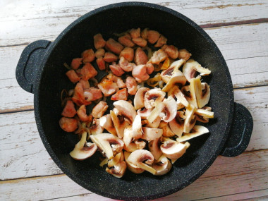 Добавьте к мясу грибы и обжарьте, помешивая, около 5-7 минут или дольше. Из грибов и мяса должна выпариться лишняя влага. Точное время обжарки зависит от выбранной части туши, размера кусочков, вашей техники и личных предпочтений.