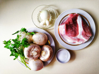 Как сделать мясо с грибами на сковороде жареное? Очень быстро и просто! Для начала подготовьте необходимые ингредиенты по списку. Какое мясо можно брать помимо свинины? Любое. Подойдет говядина, баранина, курица или индейка. Но при этом учитывайте, что изменится калорийность и время приготовления блюда. Помимо указанных специй можете добавить свои по вкусу.