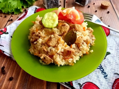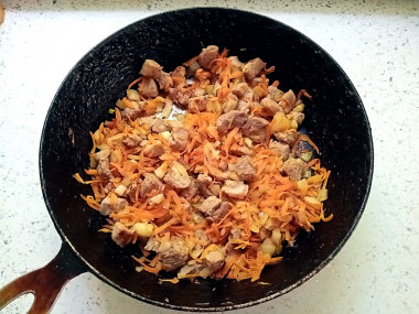 Мясо я быстро обжарила до румяной корочки, а затем еще минут 10 с овощами на небольшом огне. Рис при этом тоже держала в воде. Так и часть крахмала вымоется и рис слегка разбухнет. Дальше готовила как плов. После приготовления все перемешала.
