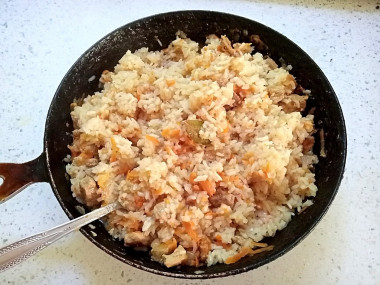 Всей моей семье очень понравилась рисовая каша с мясом. Это почти как плов, только на сковороде.