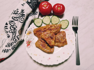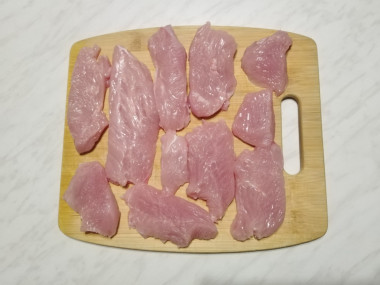 Филе грудки индейки нарежьте порционными кусочками толщиной, примерно 2 см. Очень тонко резать не надо. Так оно будет не жариться, а просто высохнет.