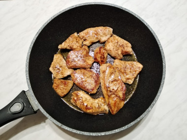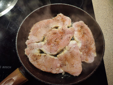 Для жарки берите широкую сковороду, чтобы мясо можно было выложить в один слой. Разогрейте сковороду до горячего состояния, влейте масло и выложите подготовленные ломтики грудки индейки. В горячем масле они сразу будут менять цвет. Так и должно быть. О том, как подобрать идеальную сковороду, а также как правильно выбрать растительное масло, читайте в отдельных статьях, ссылки в конце рецепта.