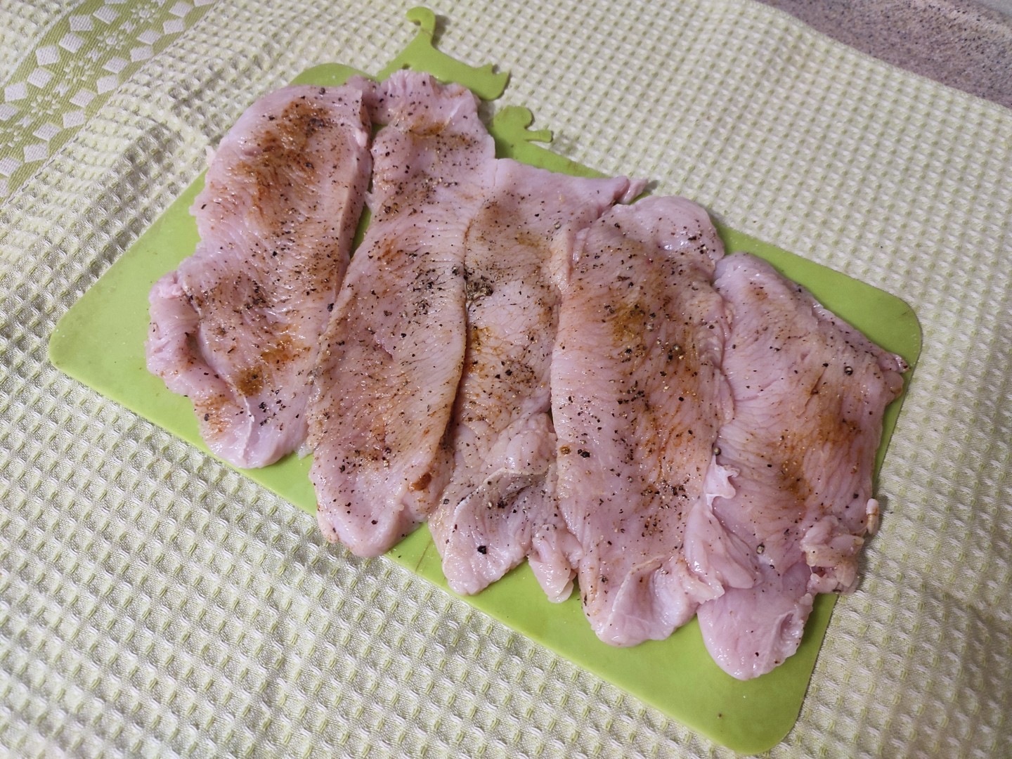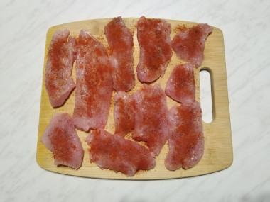 Посыпьте ломтики мяса с двух сторон солью, молотым перцем, паприкой и карри. Вотрите специи в мясо и оставьте полежать минут на 15. Специи успеют придать мясу аромат.
