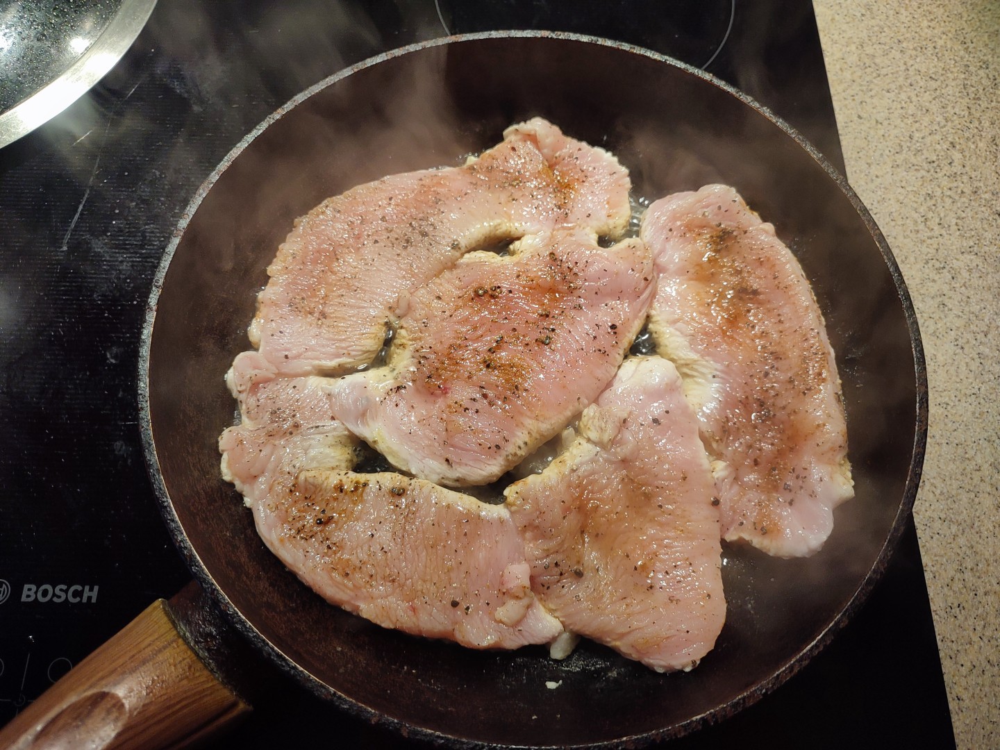 Затем закройте сковороду крышкой, сделайте огонь чуть меньше и готовьте еще 2-3 минуты. Мясо индейки готовится очень быстро, поэтому не переживайте, что оно не успело приготовиться.