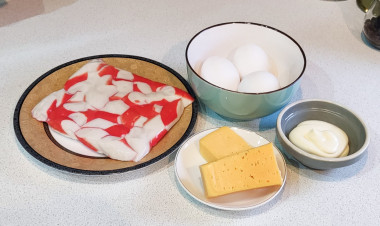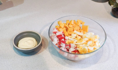В салатнике соедините крабовые палочки, яйца и сыр.
