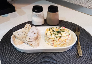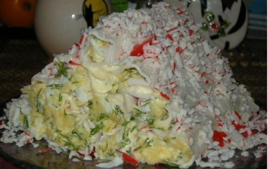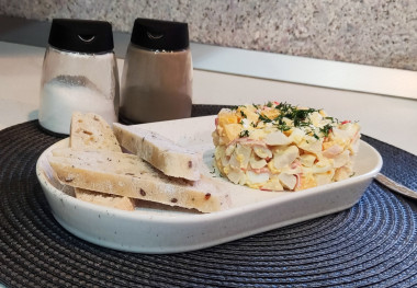 Знаю вариант такого крабового салата с добавлением чеснока и без яиц.