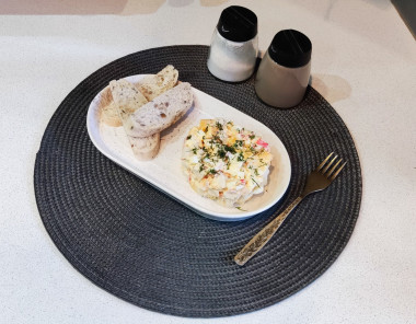 Очень понравился салат с крабовыми палочками сыром и яйцом. Лёгкий, вкусный, быстро готовится, из простых продуктов.