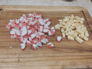 Крабовые палочки очистите от пленки и нарежьте небольшими кубиками. Пленка, в которую завернута каждая крабовая палочка, иногда плохо снимается. Чтобы облегчить процесс, подержите палочки над паром в течение 1-3 секунд.