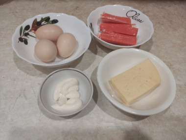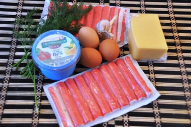 Как сделать салат с крабовыми палочками сыром и яйцом? Подготовьте продукты. В салат пойдут как крабовые палочки, так и крабовое мясо. Если они были заморожены, то предварительно разморозьте их. Сыр возьмите качественный, натуральный, вкусный, без заменителей молочного жира. Лучше выбирайте твердые или полутвердые сорта.