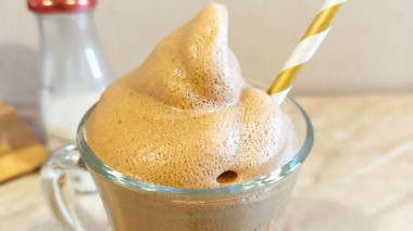 Можно сделать еще быстрее. Смешать в высоком стакане заваренный кофе, сахар и молоко и взбить до появления пены. Затем по желанию добавить кубики и подать к столу.