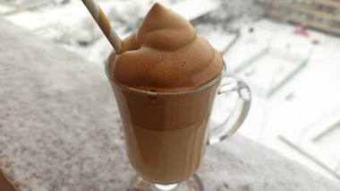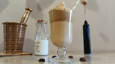 Как то я уже готовила такой напиток, опыт есть. Но в этот раз получилось у меня только со второй попытки. Сначала я взяла более широкую посуду, это не удобно, летят брызги и кофе плохо взбивается. Во второй раз взяла узкий стакан от блендера и собственно сам блендер с насадкой венчик. А еще во второй раз добавила чуть меньше кипятка. Взбивала минуты три и на этот раз получила устойчивую пену!