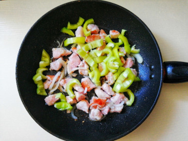 Болгарский перец очистите от сердцевины и нарежьте полосочками. Добавьте перец в сковороду к мясу.