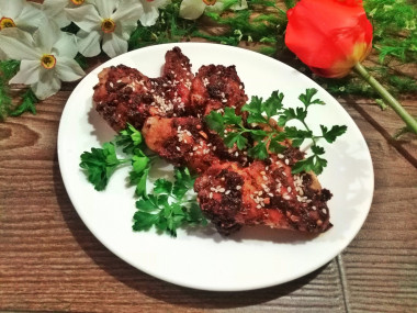 Крылышки с этим маринадом потрясающе вкусные. Получаются сочными и мягкими внутри, а снаружи аппетитная и хрустящая корочка. Для красоты посыпала крылья кунжутом. Кушали с овощным салатом.