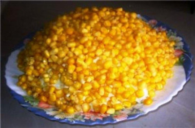 Последним слоем будет идти консервированная кукуруза. Слейте из баночки всю жидкость и выложите кукурузу сверху салата. Аккуратно снимите сервировочное кольцо. Перед подачей салат немного охладите в холодильнике. Готовый салат подавайте к столу, украсив свежей зеленью. Приятного аппетита!