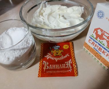 Подготовьте необходимые ингредиенты для крема. Их количество можете увеличить на своё усмотрение, если планируете промазывать коржи более щедро и делать выравнивание. Очень важно выбрать качественные сливки, которые хорошо взобьются. Выбирайте сливки жирностью не менее 33%. При желании можно добавить в крем 3 ст. л. кокосовой стружки.