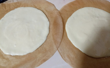 На качественном силиконизированном пергаменте карандашом начертите круги диаметром 18 см. Правильно выбрать пергаментную бумагу вы сможете, прочитав отдельную статью про особенности пергамента, ссылка есть в конце рецепта. Выложите пергамент на противень. С помощью ложки или лопатки выложите немного теста и разровняйте, формируя ровные тонкие круги. Пергамент можете заменить на специальные силиконовые коврики для выпечки.