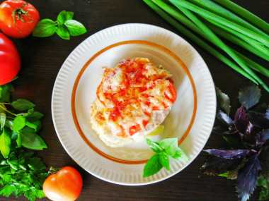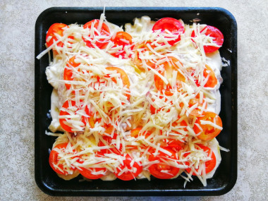 Затем на мясо выложите нарезанные помидоры.