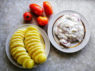 Затем нарежьте картофель кружочками и смешайте с мясом.