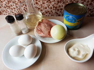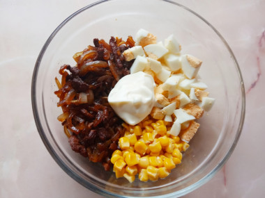 К ужину решила приготовить сытный салат с мясом и кукурузой. Для более насыщенного и пикантного вкуса нарезанное соломкой мясо свинины до обжарки выдержала некоторое время в соевом соусе ( около получаса), затем мясо обжарила минут 5, добавила лук, жарила вместе до мягкости лука ( не солила, так как мясо мариновалось в соевом соусе). К остывшему мясу с луком добавила кукурузу, нарезанные отварные яйца, заправила салат майонезом, добавила черный молотый перец. Салат очень сытный, вкусный. Поужинали с удовольствием! Спасибо за рецепт, Юлия М!