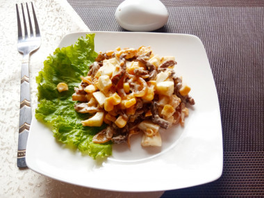 Также в качестве заправки можно использовать не только майонез, но и сметану или натуральный йогурт. Их можно взять по отдельности либо смешать с майонезом в любой пропорции на свой вкус - это снизит калорийность блюда.
