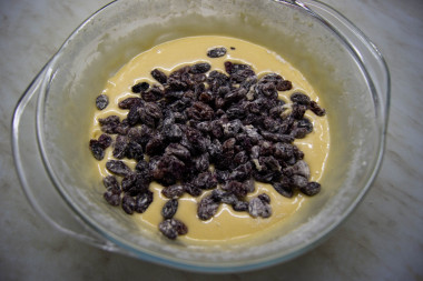 Изюм вымойте, обсушите. Всыпьте в тесто большую часть изюма и перемешайте. Изюм можете брать любой - темный или светлый, крупный или мелкий.