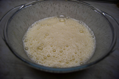 В миске взбейте яйца с сахаром и ванильным сахаром до пышности. От того, как вы взобьете яйца, зависит воздушность вашего пирога. Нельзя взбивать массу прямо добела и до плотности - белок утратит воздушные пузырьки, которые поднимают тесто. И в таком случае не поможет даже разрыхлитель. Тесто либо не поднимется совсем, либо поднимется очень слабо.