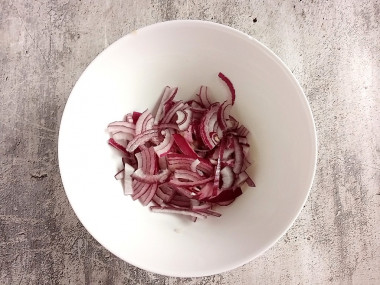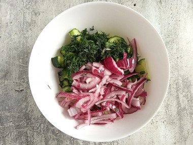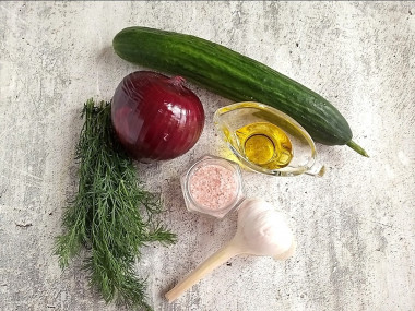 К ужину очень быстро сделала салат из огурцов с чесноком. Огурец у меня гладкий с тонкой шкуркой. Если шкурка грубая, то ее лучше срезать. Мне хватило одного большого плода для салата на двух человек. Укроп хорошо промыла и обсушила. Он нежный и сочный, а при нарезке появляется такой душистый аромат! Зубчик чеснока пропустила через пресс и смешала с оливковым маслом. Салат решила дополнить красным луком, который нарезала четвертькольцами и замариновала в небольшом количестве яблочного уксуса. Все ингридиенты смешала и посыпала гималайской солью.