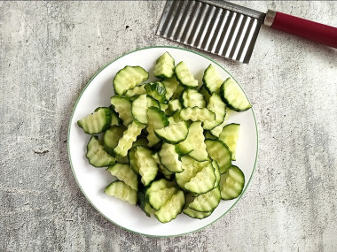 - Для красоты можно нарезать огурцы не кружочками, а длинной тонкой соломкой с помощью овощечистки.