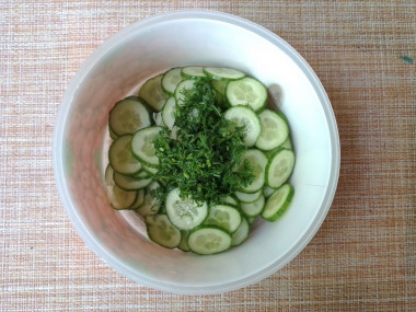 В миске соедините нарезанные огурцы, укроп и пропущенные через пресс зубчики чеснока. У меня чеснок молодой, ядреный. Поэтому хватило двух крупных зубчиков. Если чеснок уже полежавший, то можете взять 3 зубчика, ориентируясь на собственные предпочтения.