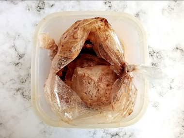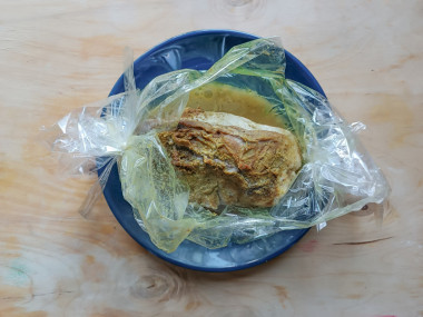 Для маранада взяла домашнюю горчицу, замешаную на рассоле от огурцов. Добавила соль, паприку и карри. Мясо хорошенько натерла, помассировала и выложила в рукав для запекания. Оставила на столе на пол часа, чтобы свинина получше промариновалась.