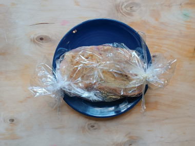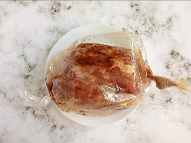 Отрежьте от рукава кусок такой длины, чтобы в него помещалось мясо и его можно было легко завязать. Уложите мясо в рукав, концы завяжите узлами. Не используйте специальные зажимы — в них могут присутствовать металлические элементы. Возьмите форму для запекания, которую можно ставить в микроволновку. Положите в нее рукав с мясом, концы заправьте вниз. Обязательно проткните рукав зубочисткой в нескольких местах для выхода пара.