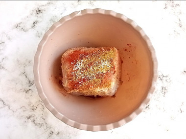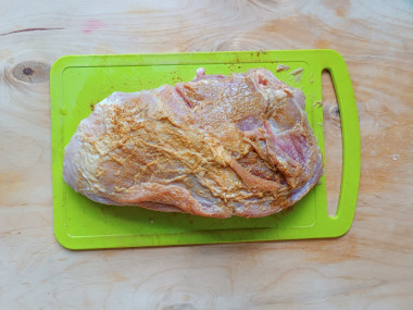 Обмойте кусок мяса и хорошенько промокните его со всех сторон бумажными полотенцами. Обмажьте кусок горчицей. Я взяла сладкую, вы можете использовать любую другую. Далее натрите мясо солью и сухими специями. У меня смесь сладкой паприки, молотого черного перца и приправы для мяса. Опять же, какие специи будете использовать вы, зависит от ваших же предпочтений.