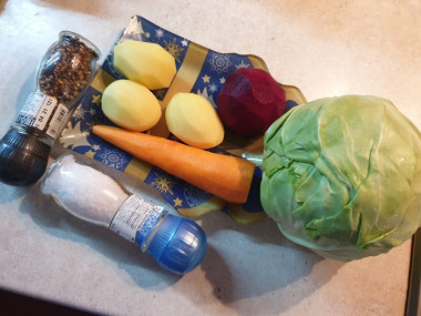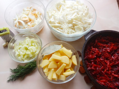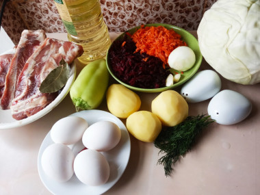 Калорийность продуктов: Картошка, Капуста, Говядина, Яйца, Болгарский перец, Чеснок, Лавровый лист, Перец черный молотый, Укроп, Соль, Вода, Лук, Свекла, Морковь, Растительное масло