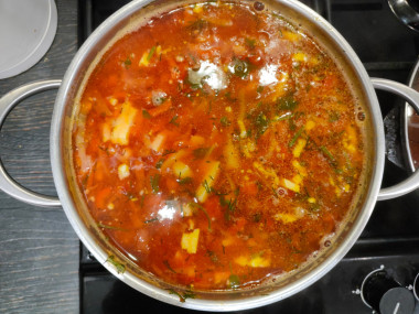 Накройте кастрюлю крышкой и дайте борщу настояться 15 минут. Затем разлейте по тарелкам и подайте к столу. Приятного аппетита!