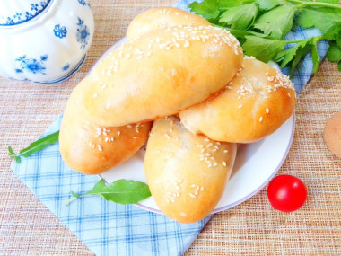 Готовые пирожки выкладывайте на противень, застеленный кулинарным пергаментом. Дайте им минут 10 полежать. Затем смажьте поверхность пирожков яичным желтком. По желанию можно посыпать немного кунжутом. Поставьте противень в духовку, предварительно разогретую до 180 градусов, на 20-30 минут. Время указано приблизительно, ориентируйтесь на свою духовку. Подробнее о работе разных духовок читайте по ссылке в конце рецепта.