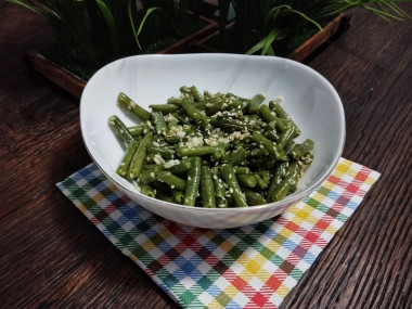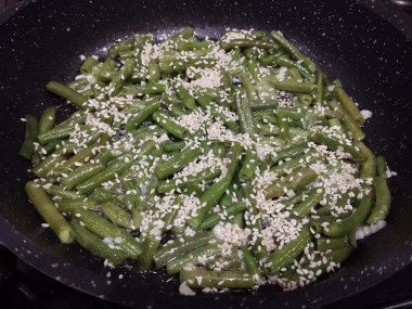 Фасоль отварила в течение нескольких минут, слилаводу, сполоснула холодной водой. Чеснок измельчила и обжарила на сковороде. Добавила фасоль, кунжут и обжарила вместе с чесноком до готовности.