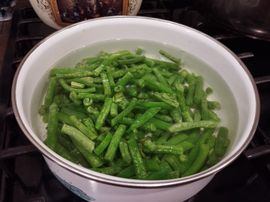 Если фасоль у вас свежая, то сначала помойте ее, очистите жесткие части и нарежьте на кусочки длиной 4-5см. Вскипятите в сотейнике воду, посолите ее. Закиньте в кипящую воду фасоль (замороженную кидайте прямо так). После повторного закипания проварите фасоль пару минут. Затем откиньте ее на дуршлаг и обязательно обдайте холодной водой (можно из-под крана) — это поможет сохранить фасоли яркий зеленый цвет.