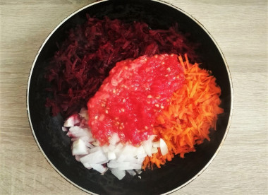 Протушите свеклу на сковородке, смазанной растительным маслом, с уксусом и томатной пастой до готовности. При необходимости подлейте немного воды.
