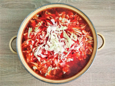 Добавьте свеклу, морковь, лук и фрикадельки к картошке. Варите до полуготовности капусты.
