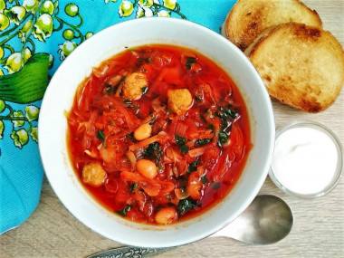 Борщ сибирский с фрикадельками и томатной пастой приготовила со свежими томатами, протушив на сковороде сразу все овощи - лук, морковь, помидоры и свеклу. Капусту добавляла в самом конце варки, так как она сейчас молодая и быстро разваривается. Борщ получился наваристым, фасоль и фрикадельки из свиного фарша делают его очень сытным. Очень вкусный борщ!