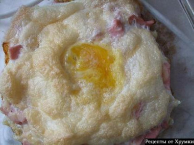 На сыр выложить взбитый белок, разровнять, сделать в центре углубление.