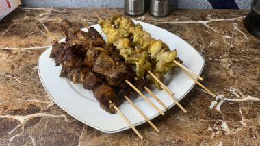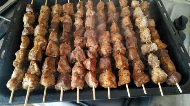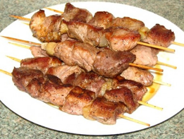 Из данного количества мяса у меня получилось 6 шашлычков. Я брала свиную шею, мясо отлично приготовилось, получилось нежным и сочным.
