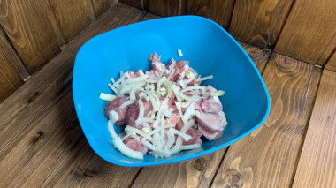 Сложите мясо в подходящую посуду, добавьте соль и специи. Положите лук, разобрав его на отдельные колечки.