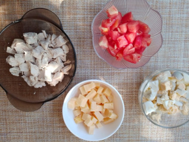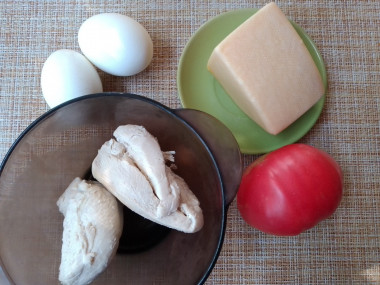 Как сделать салат с куриной грудкой сыром и помидорами? Подготовьте все необходимые ингредиенты.